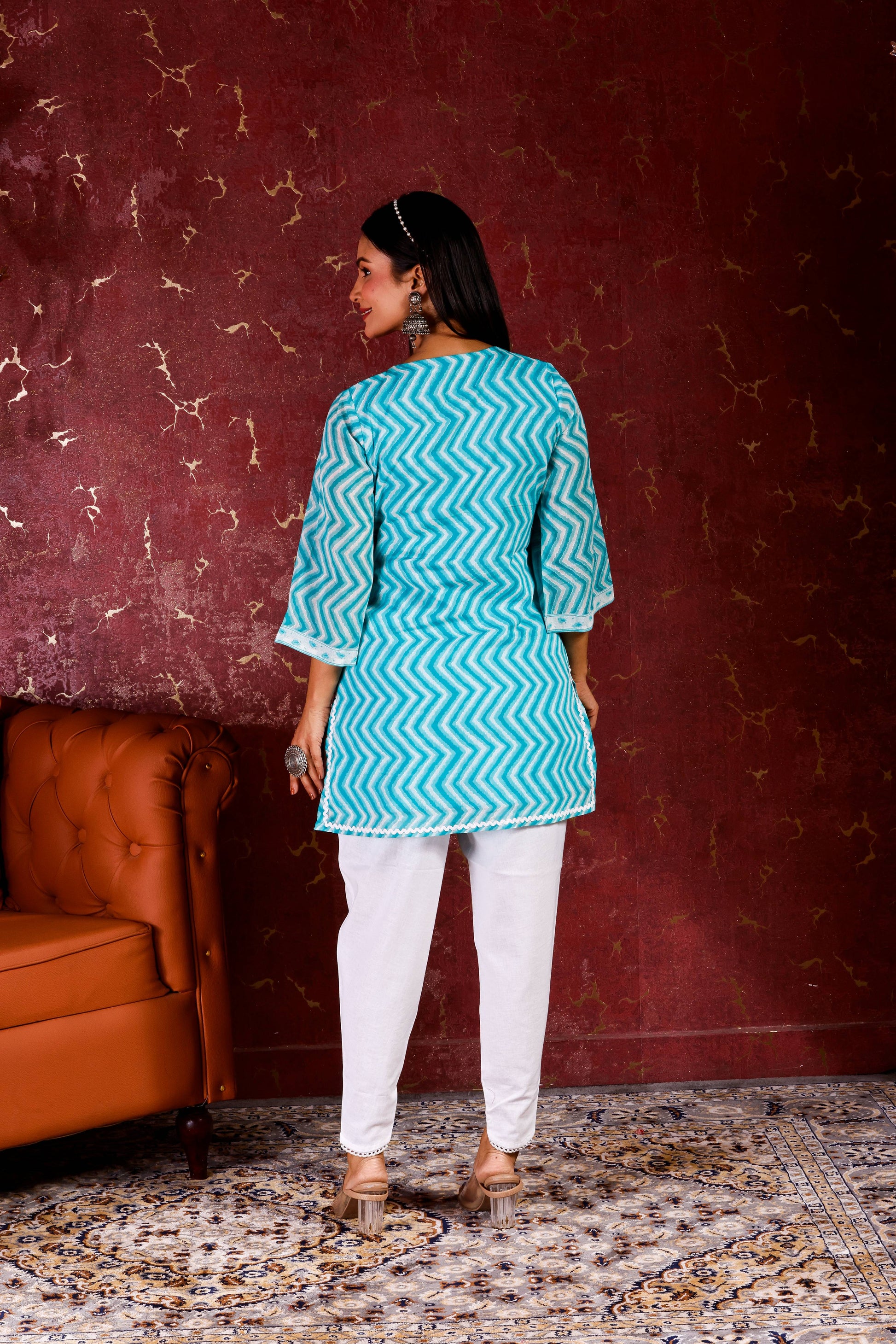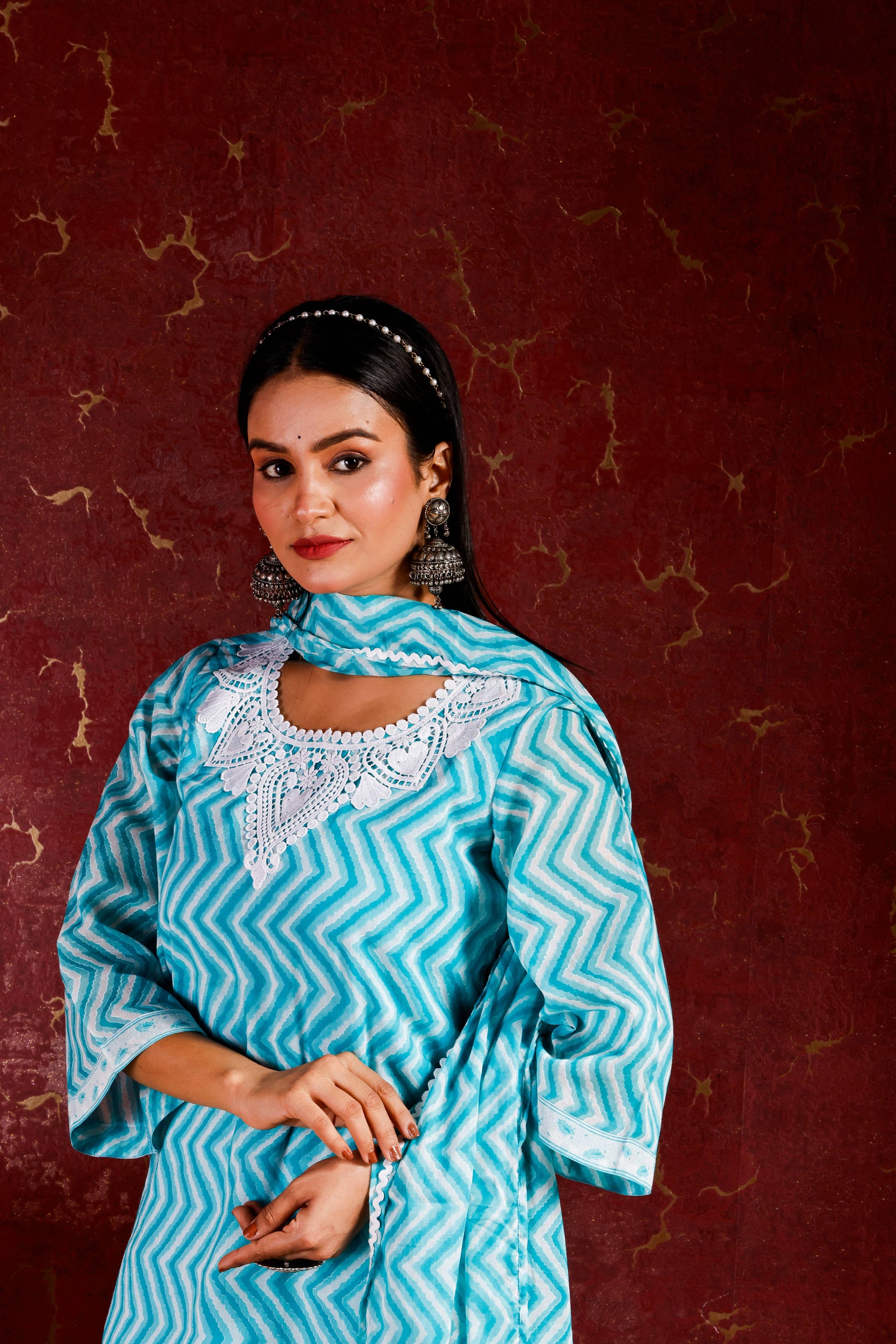 Elegant three-piece ensemble featuring a sky blue cotton kurta with striking zig-zag print, paired with matching dhoti pants and a soft cotton dupatta. Perfect for traditional occasions and everyday wear.