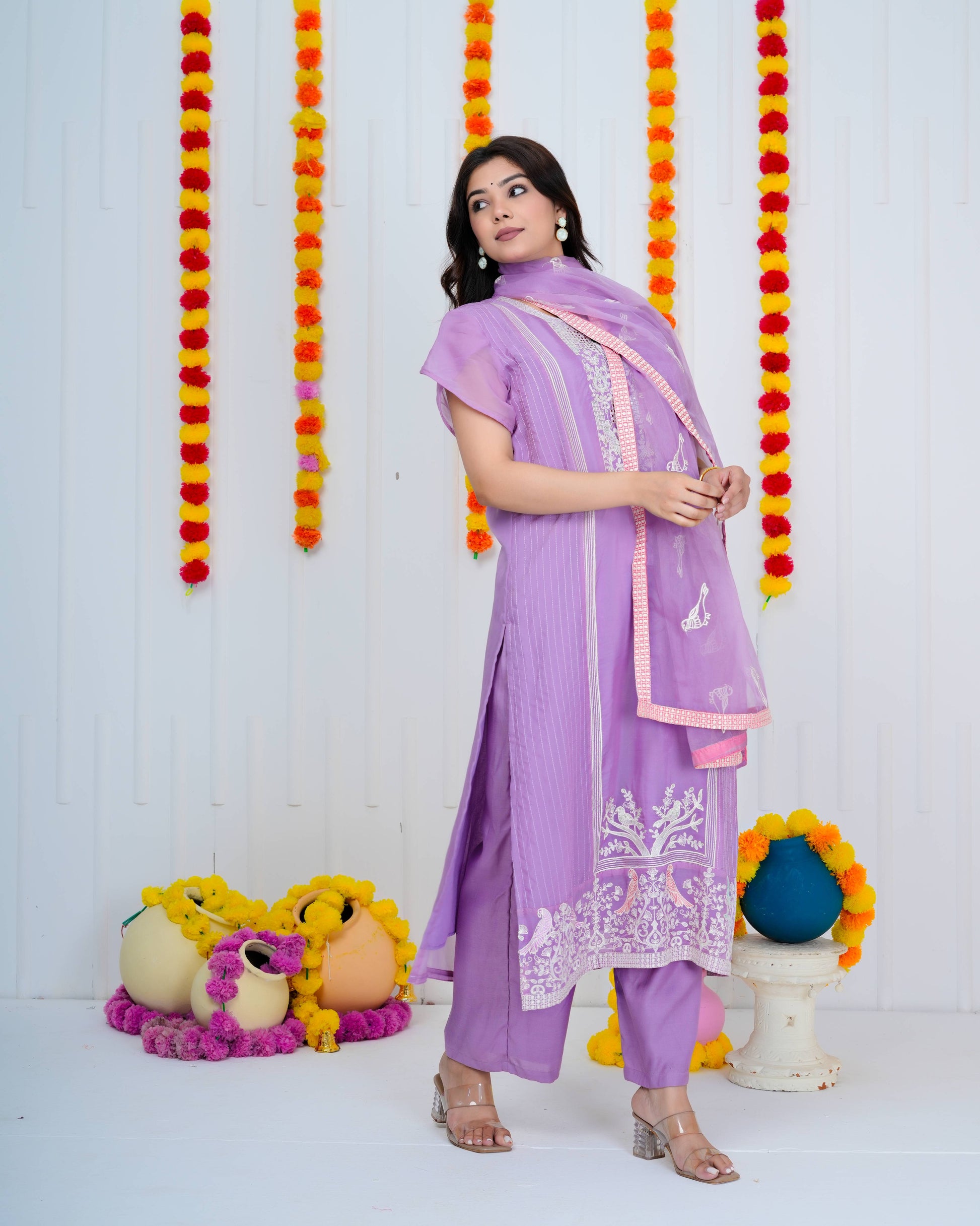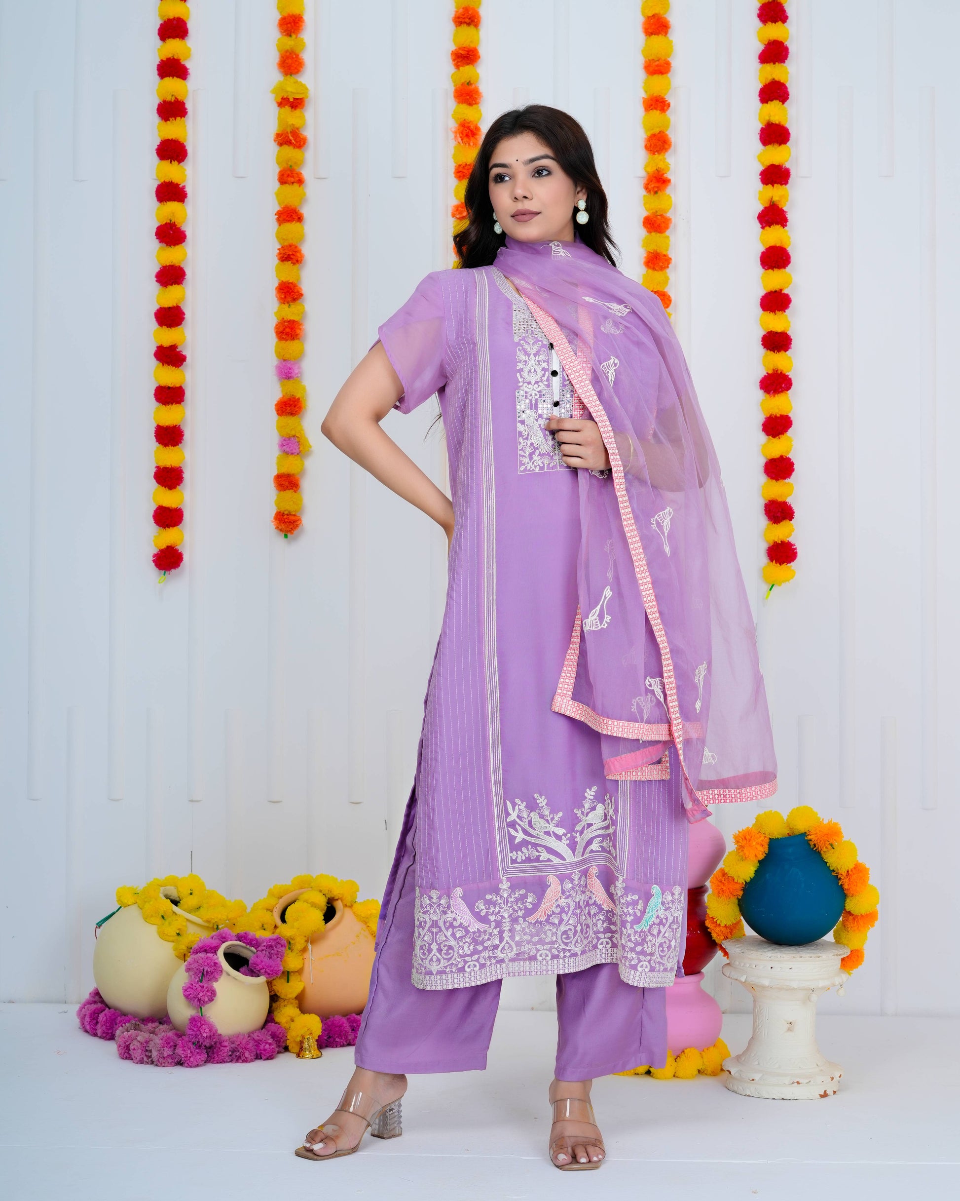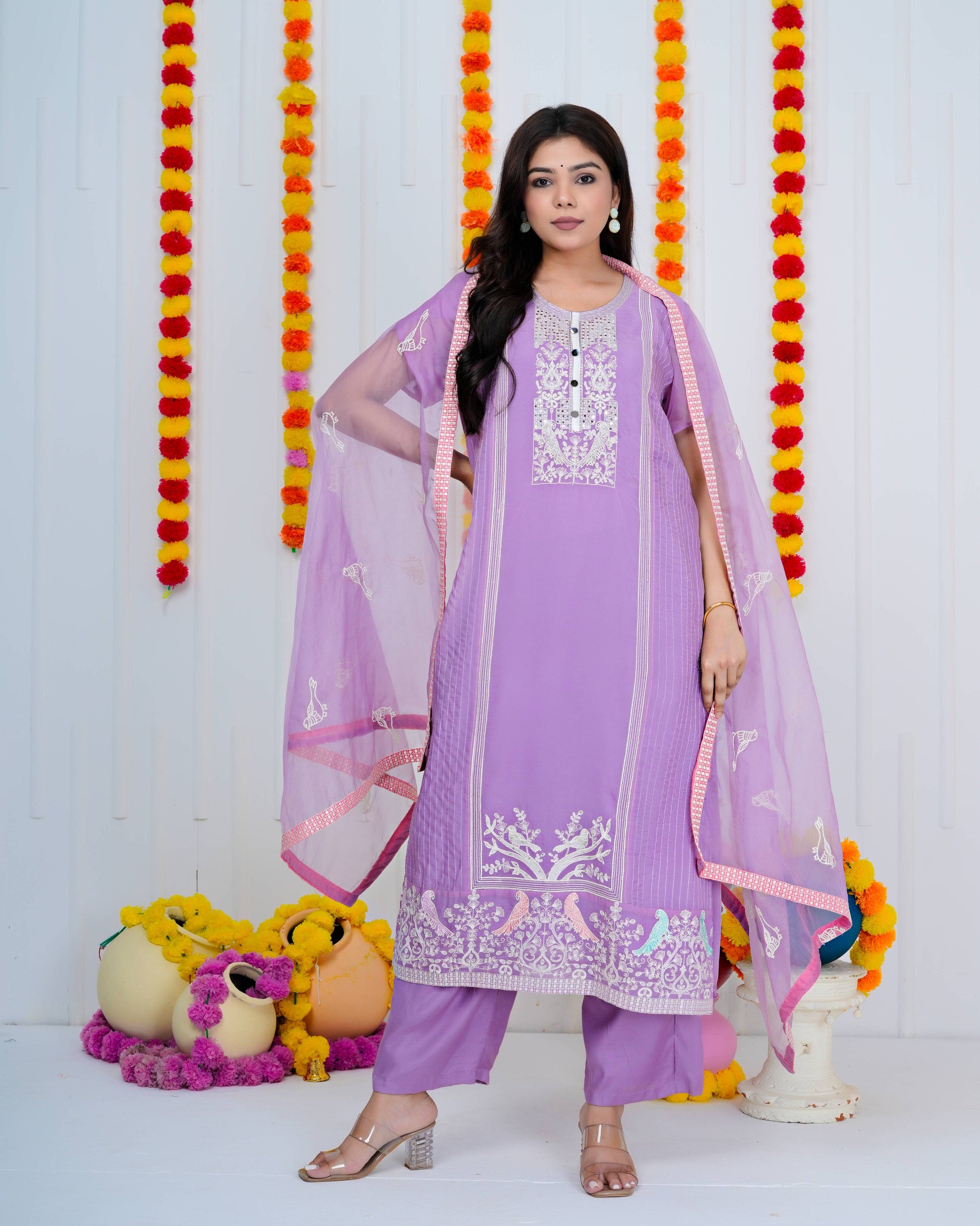 Sophisticated lilac georgette suit featuring meticulously crafted bird embroidery. The ensemble includes a delicate organza dupatta and tailored matching pants, delivering refined elegance for discerning occasions.