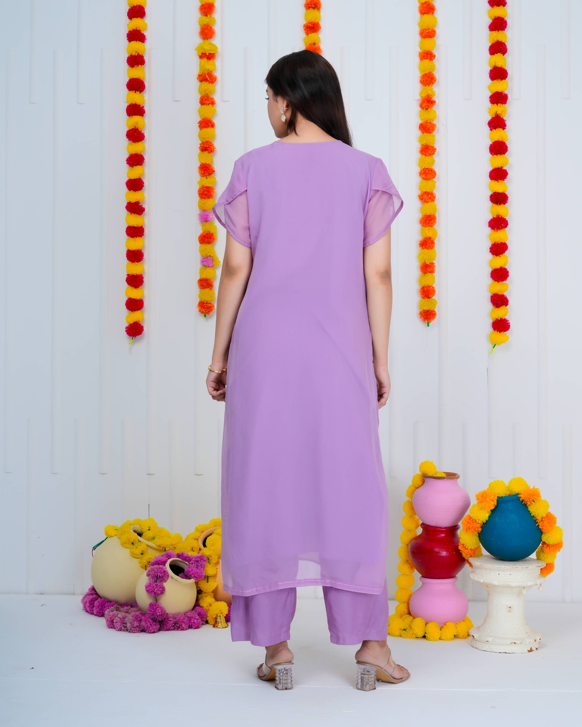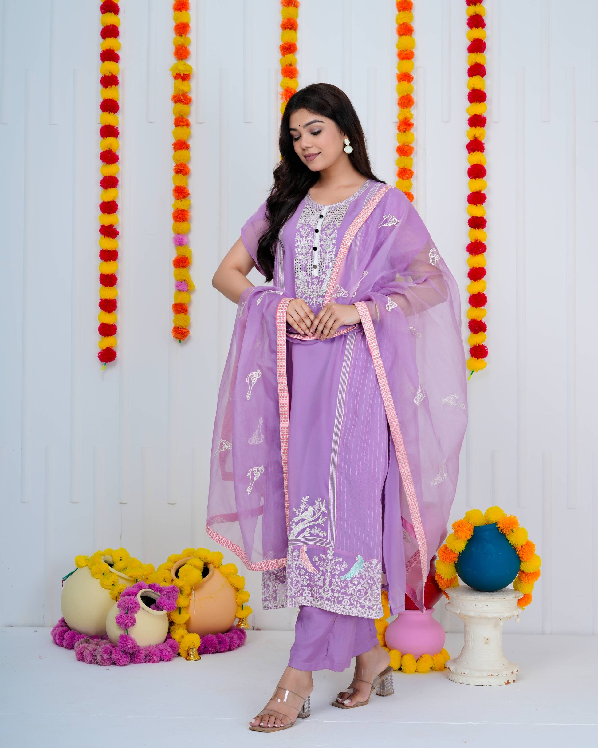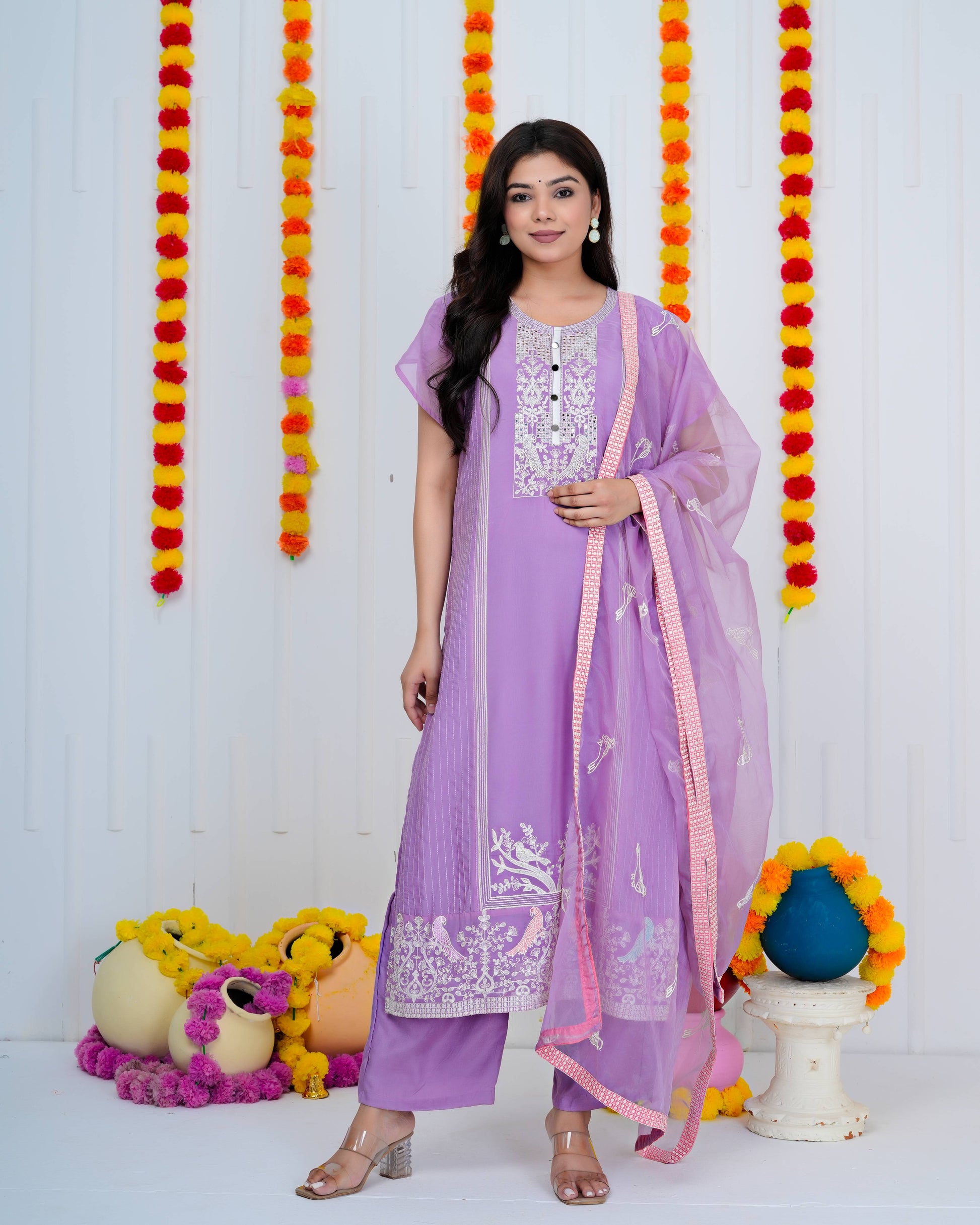 Sophisticated lilac georgette suit featuring meticulously crafted bird embroidery. The ensemble includes a delicate organza dupatta and tailored matching pants, delivering refined elegance for discerning occasions.