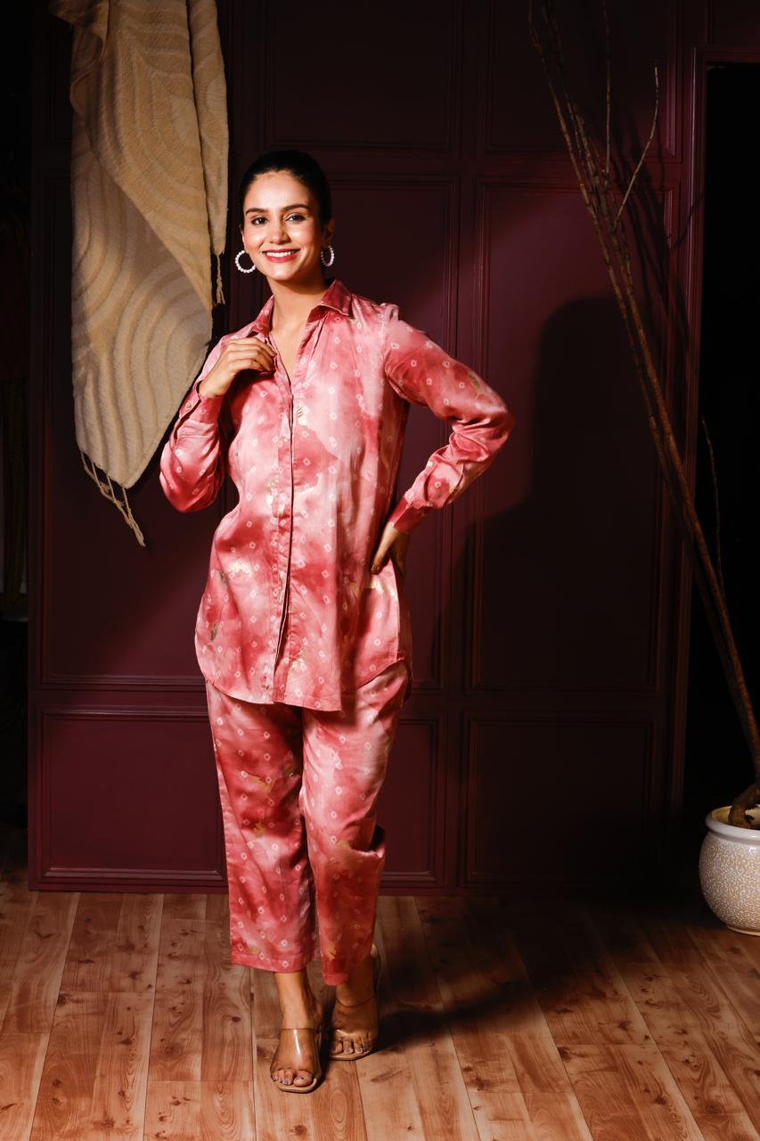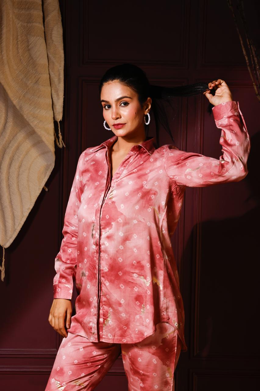 Soft pink bandhani shirt with gold foil print,full sleeves,collar neck,paired with matching straight pant. Fabric- muslin