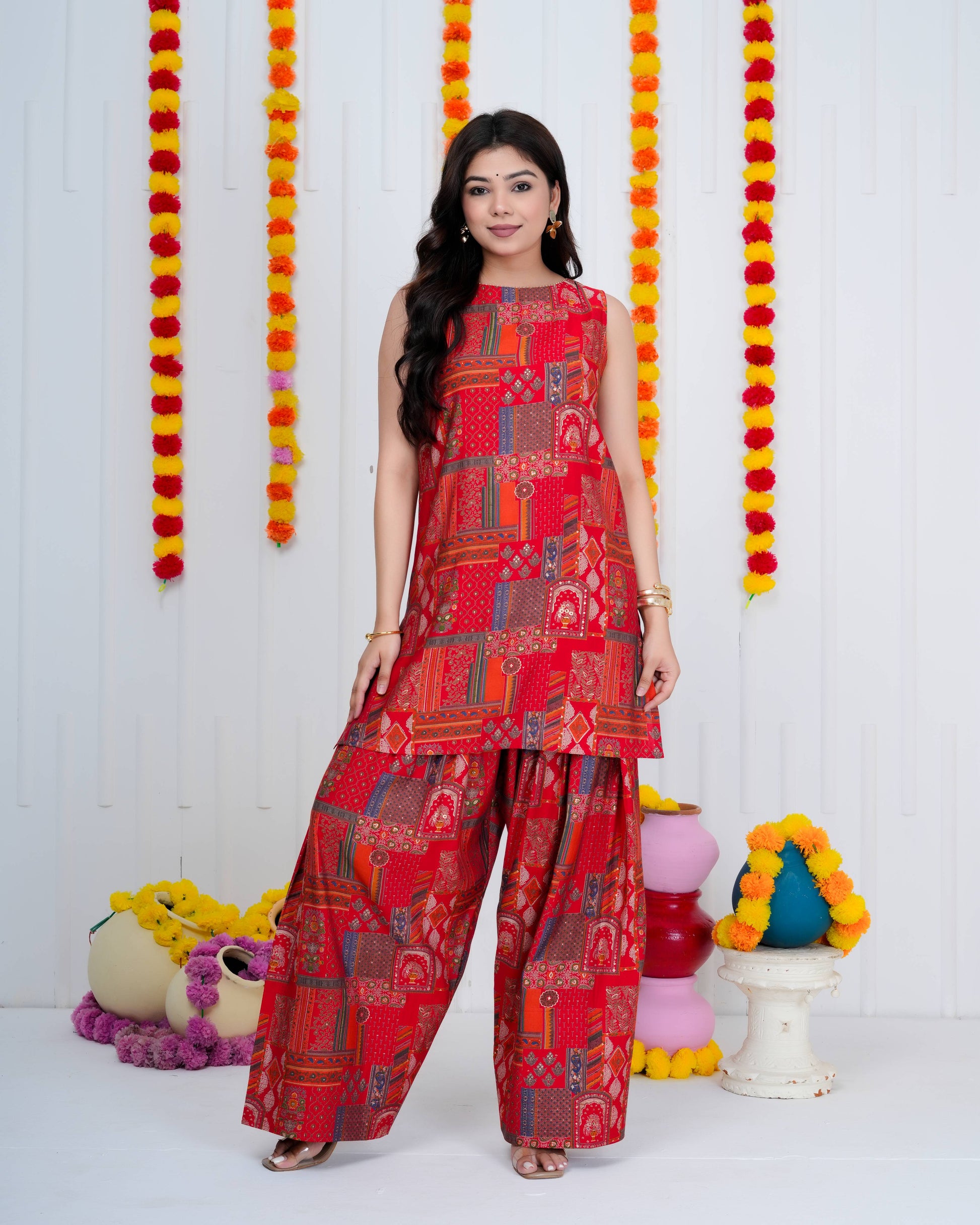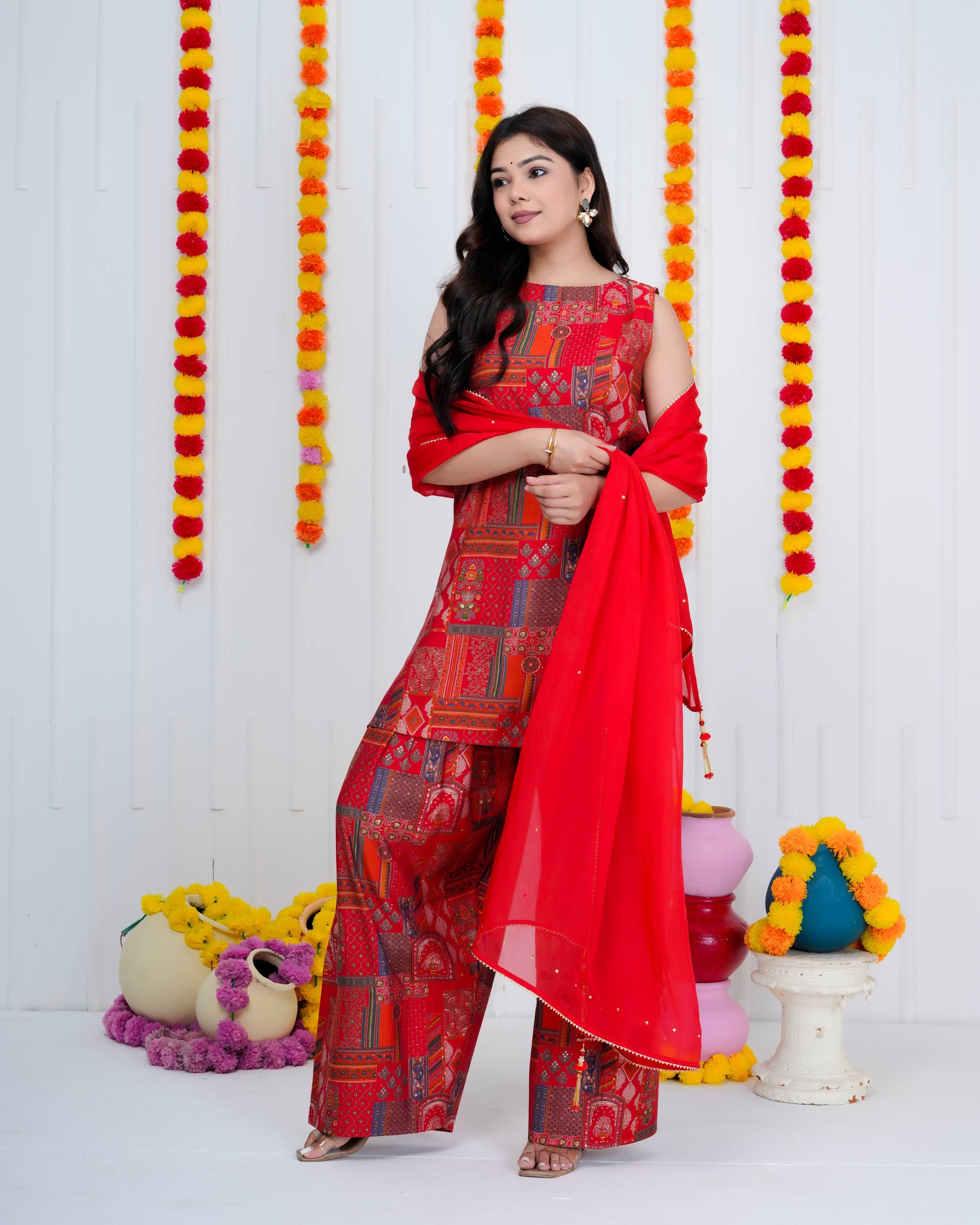 Bold red sleeveless kurta with vibrant patchwork motifs paired with matching farshi salwar and sheer dupatta. Crafted from breathable muslin with an organza dupatta for festive elegance.